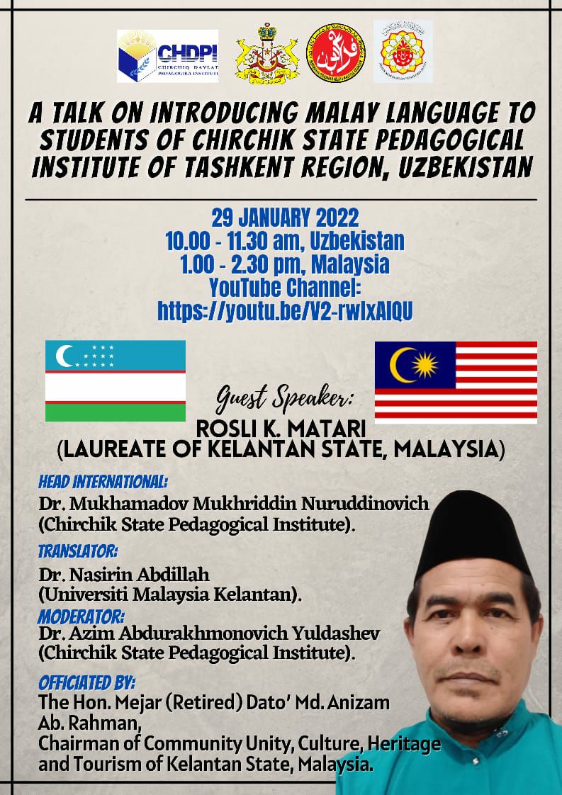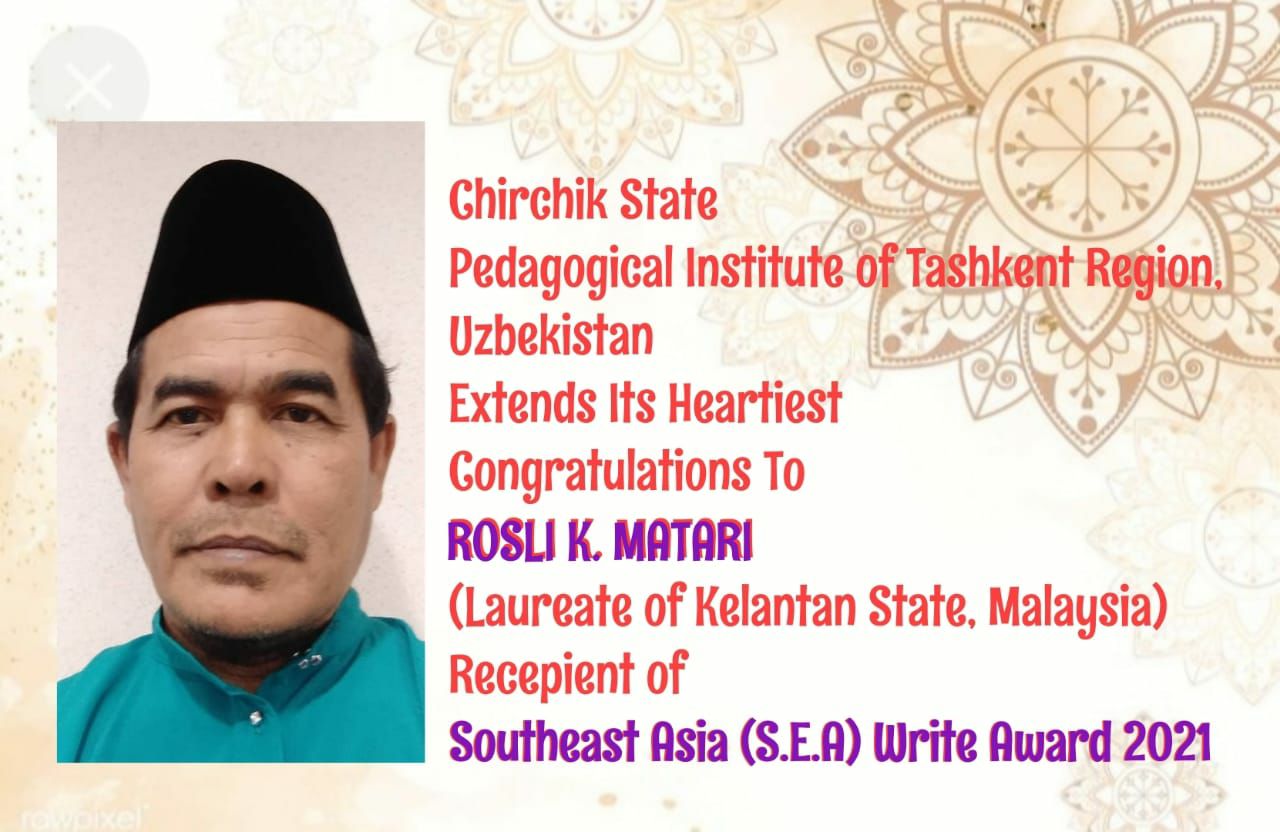 Malaysianing Klantan Shtati lauriati Rosli K. Matarini Chirchiq davlat pedagogika instituiti talabalriga Malay tili va adabiyoti haqida video maruza o’tkazgan Malay tili va adabiyotshunosi o’zining sermahsul harakatlari va sohasiga qo’shgan yutuqlari yana bir bor o’z tasdig’ini topdi. Rosli K. Matarini Chirchiq Davlat Pedagogoika Instituti nomidan yangi yutuqlarga erishgani bilan yani Janubiy Sharqiy Osia yozuvchisi mukofoti sohibi bo’lganligi bilan chin dildan qutlaymiz.
