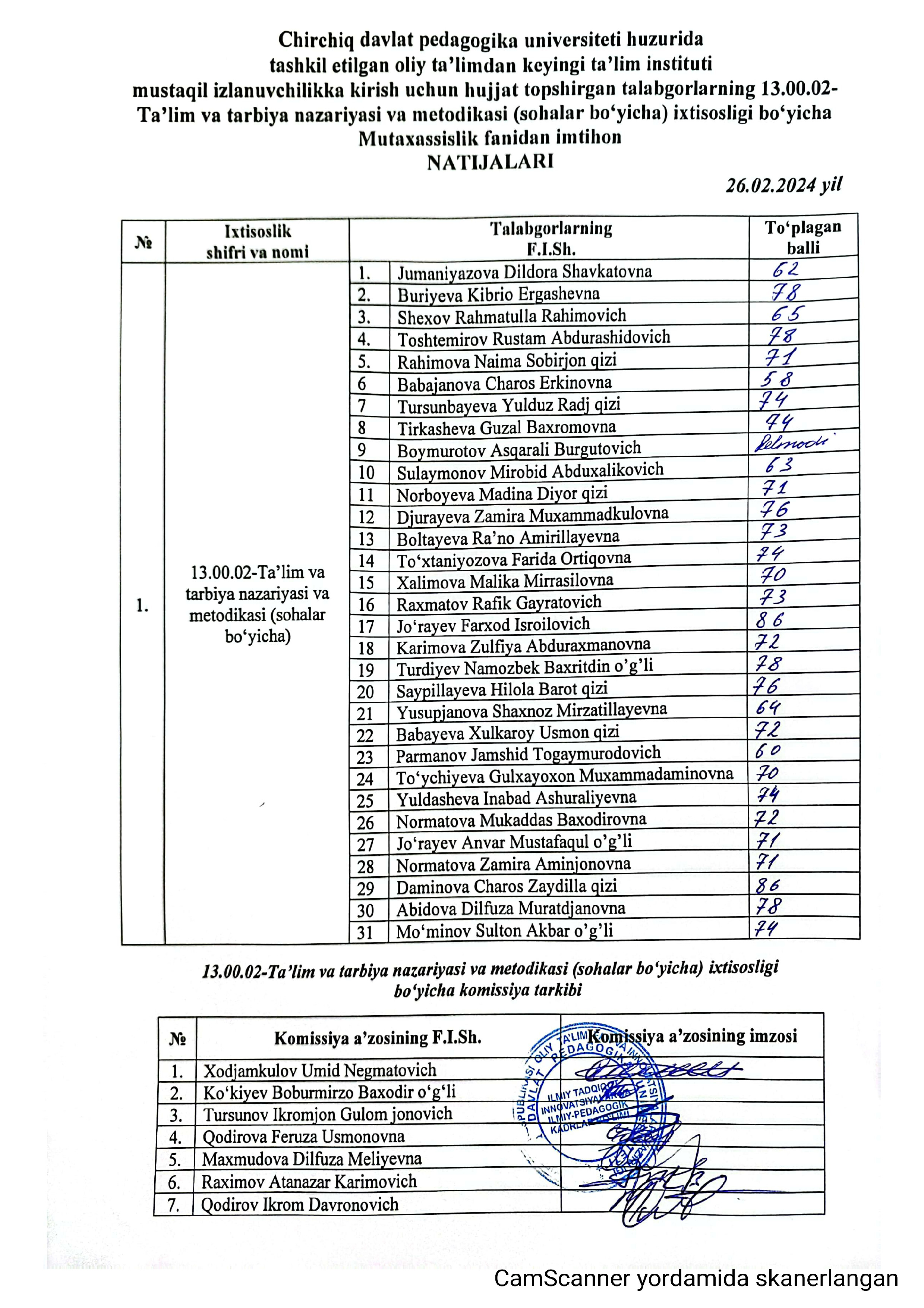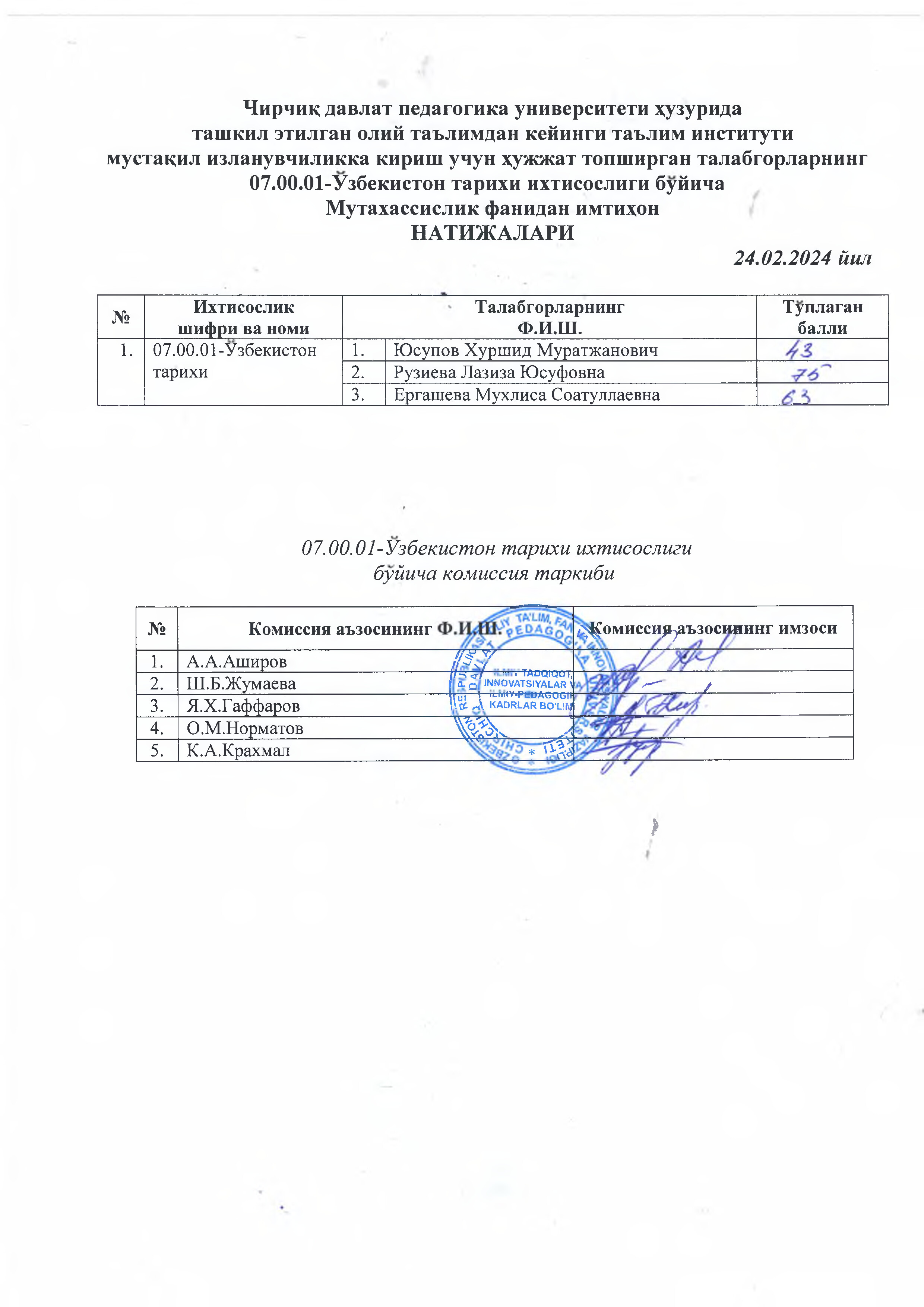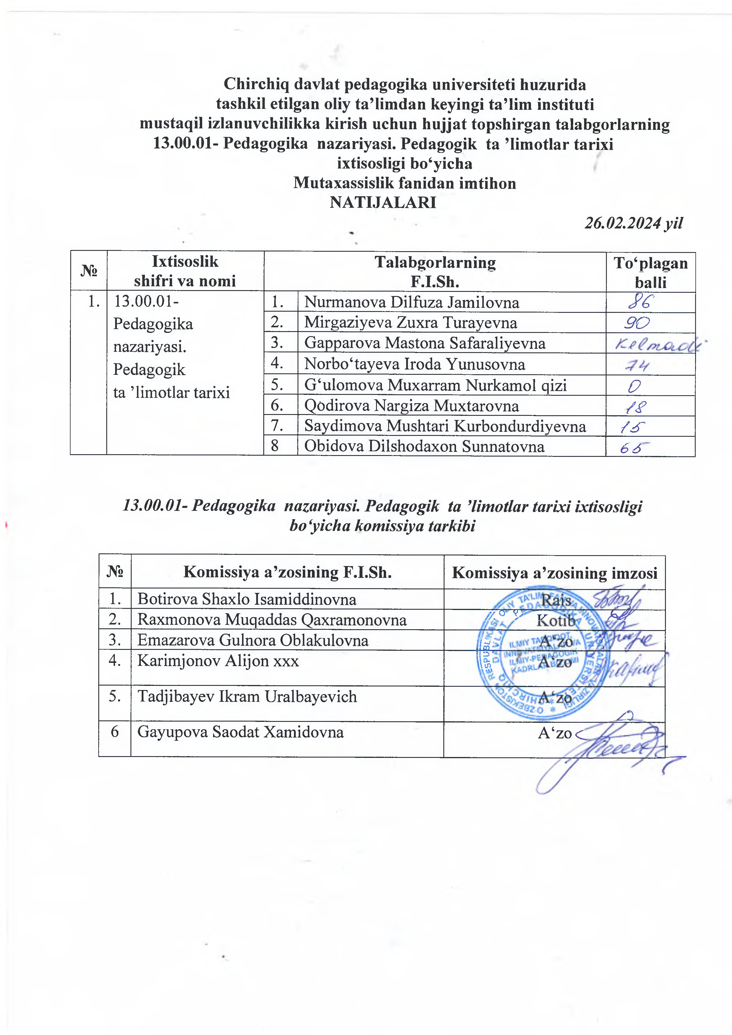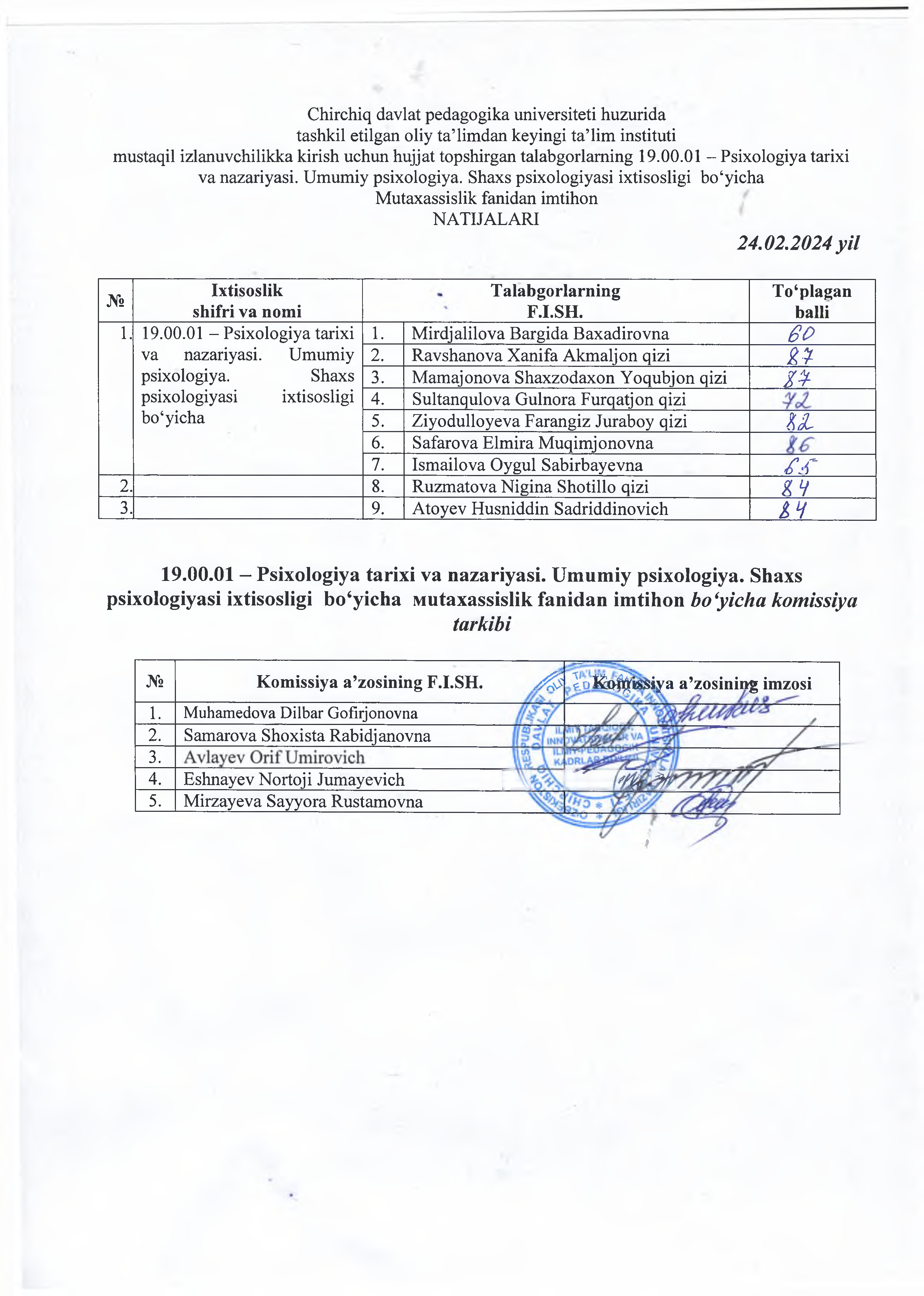 Doktorantura va mustaqil tadqiqotchilarning imtixon natijalari