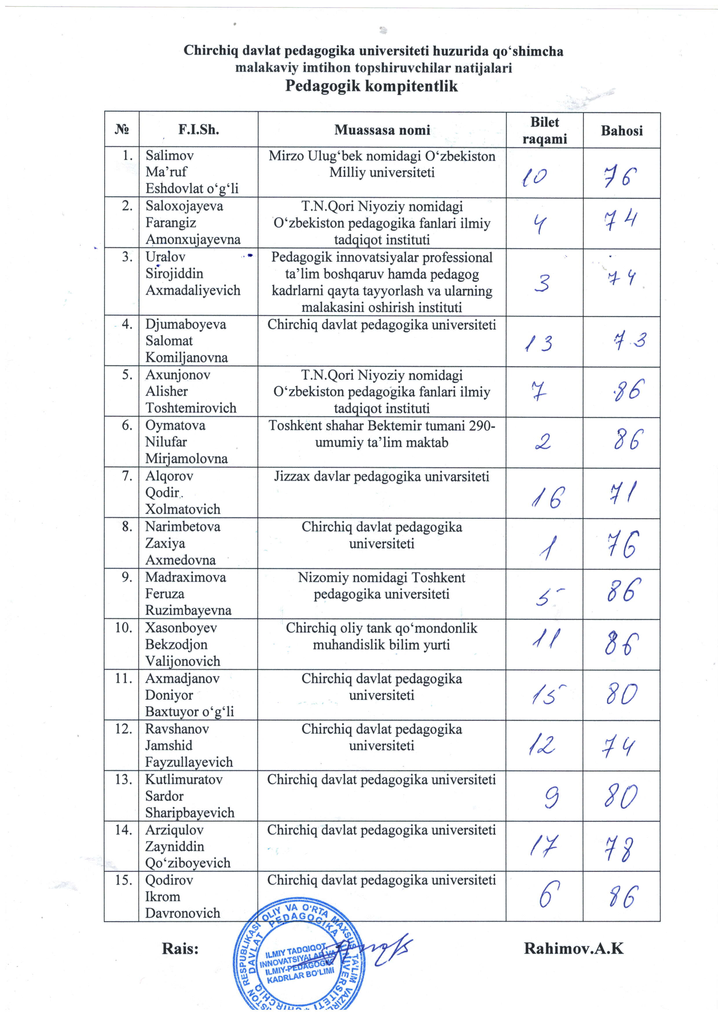 Qo'shimcha malakaviy imtihon natijalari (Pedagogik kompitentlik)