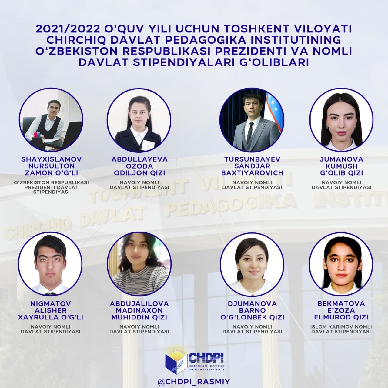 Oʼzbekiston Respublikasi Prezidenti hamda nomdor stipendiyalarni qoʼlga kiritgan 383 nafar baxtli talabalar orasida boʼlgan Chirchiq davlat pedagogika instituti talabalarini samimiy muborakbod etamiz!