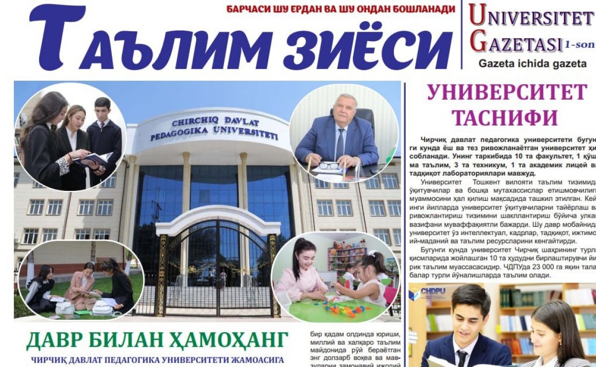 Chirchiq davlat pedagogika universiteti muassisligidagi «Ta’lim ziyosi» gazetasining birinchi soni chiqdi. Gazetaning ilk sonidan universitet Rektorining CHDPU jamoasiga yo‘llagan tabrigi joy olgan. Gazetaning birinchi sahifasida universitet Strategiyasi orqali talabalarga yaratilgan imkoniyat haqida so‘z boradi. Shuningdek, gazeta o‘quvchilari Universitet tasnifi bilan hamtanishishi mumkin.