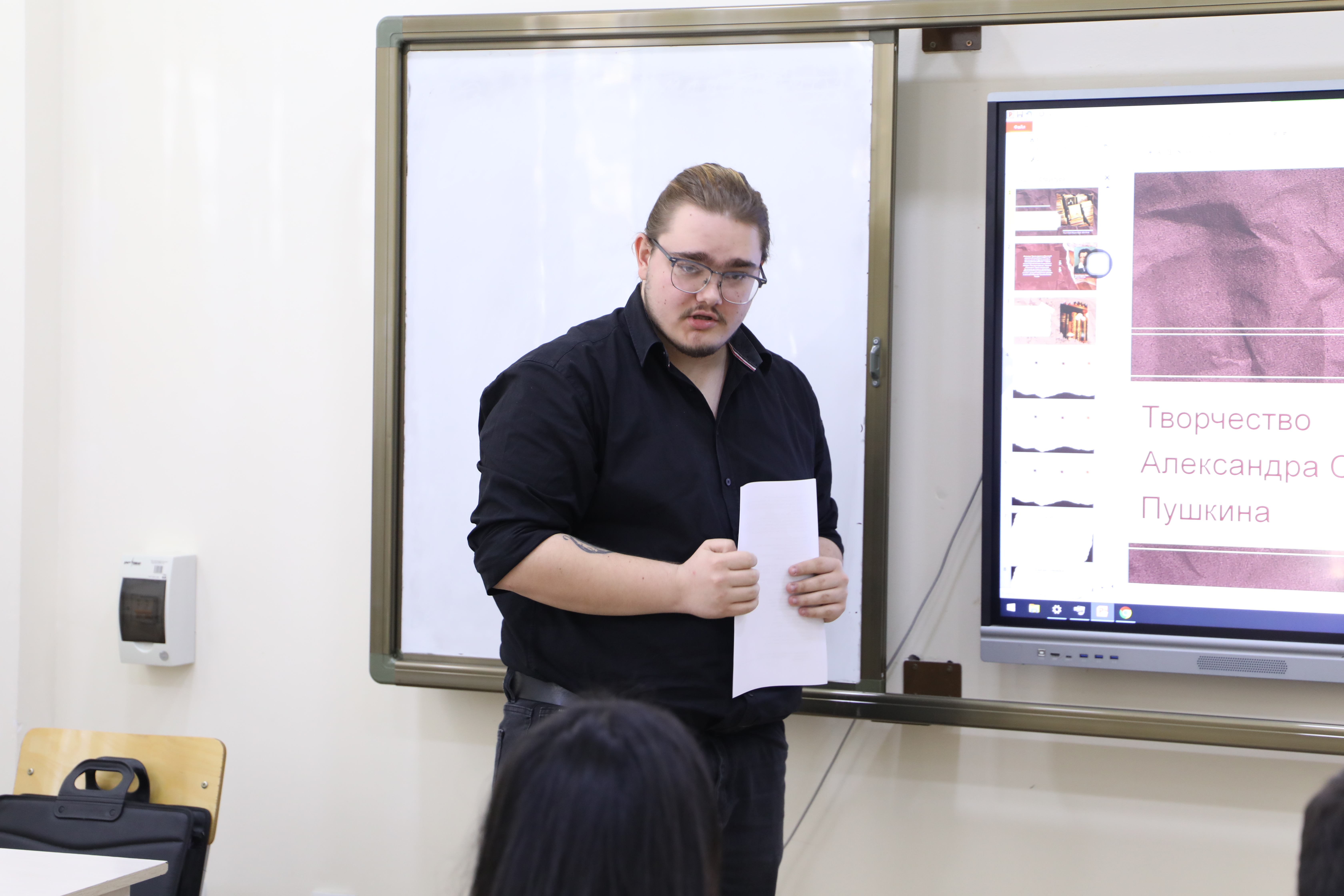 Rus tili va adabiyoti yo‘nalishida ta’lim olayotgan 4-bosqich talabasi Damir Yuldashev, Aleksandr Sergeyevich Pushkin ijodi bo‘yicha innovatsion metod - «3D dizayni» asosida ochiq dars o‘tkazdi.
